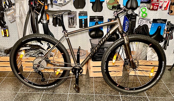 Nyistandsat, ny krank, nyt kranksæt, ny kassette og kæde, ny bagskifter, nyt skiftegreb, nye dæk og slanger, ny sadel, nye håndtag, ny støttefod, nye pedaler, nye bremsekabler og gearkabel og ny ringeklokke.
