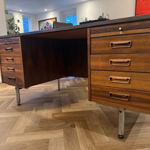 Palisander skrivebord med stål ben i flot stand. B155xD75xH72,5cm evt bytte med andet design. kunst. beolab 5
