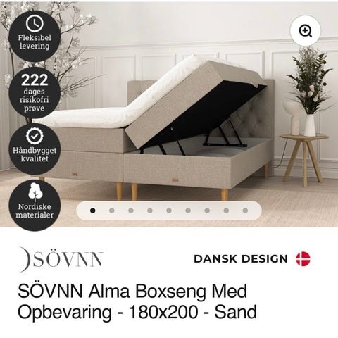 Boxmadras med god opbevaringsplads fra Nordic Dream inkl topmadras. Modellen hedder Astrid Fjäll og er 90x200 cm i sandfarvet. Fastheden er soft.