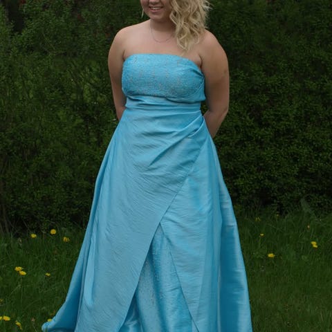 Gallakjole, petroleum grøn, mærke Swing, med perler om halsen og slids i ryggen, brugt én gang, er renset, dragtpose medfølger. Bredde om talje: 37 cm (se billede), længde fra skulder til bund: 144 cm.