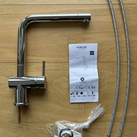 Har været tilsluttet vores køkken et års tid, men var for lille til vores håndvask. Derfor er der også lidt misfarvning fra kalk ved tuden (kan skiftes) og i den ene side ved grebet.