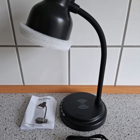 Med denne fine og funktionelle LED lampe får du ikke blot en smart bordlampe med justerbar lysstyrke og fleksibel arm, som kan vinkle lyset i den retning, som du har behov for – den har også trådløs mobiloplader og bluetooth-højtaler. Når mobiltelefonen har brug for strøm, kan den nemt lægges direkte på den trådløse opladerstation ved lampens fod, hvorefter opladningen kan begynde – helt uden at tilslutte en ledning til mobiltelefonen. Via den indbyggede bluetooth-højtaler kan du afspille din yndlingsmusik ved arbejdsbordet,