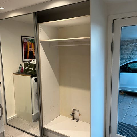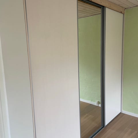 Skydeskabslåger med skinner loft/gulv fra HTH. Spejl og hvidt glas