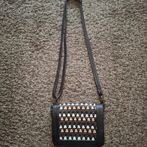 Gaven til den genbrugsbevidste. God og rummelig skuldertaske i turkisgrønt blødt læder med flerfarvet rem (købt hos Noa Noa) med inderlomme med lynlås. Der kan være computer mv.