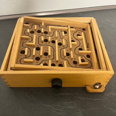 Gaffel Labyrint Brio, brætspil, Spillet er i fin stand, æsken har set bedre dage. Her et gammel spil fra Brio. Ingen regler men Spillet spilles som det klassiske labyrint spil.