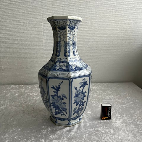 Høj slank vase med små blade indgraveret. Højde 30,2 cm,diameter 6,8 cm. Fin stand hvis man ser bort fra kalkaflejringer.