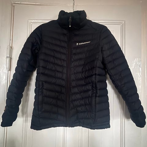 Klassisk sort dunjakke fra Peak Performance (JR Frost) letvægtsjakke egnet til både piger og drenge. Nypris omkring 2.000 kr.