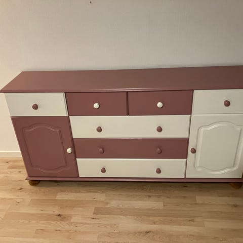 Kommode i flot stand med glasplade ovenpå. Ikke som sådan nogle brugsspor. Justerbar ben.