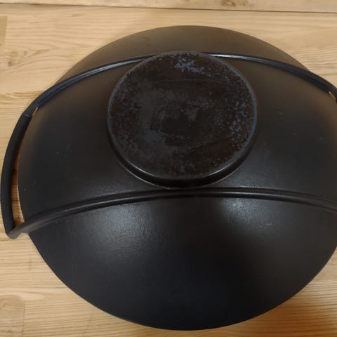 Sælger en stor Le Creuset wok i støbejern med originalt glaslåg.