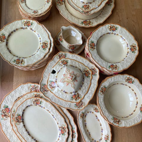 Stel, blomsterstel, vintage, tallerkener, kopper, liljeblomst