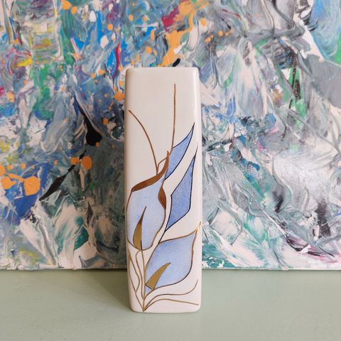 Sød lille hånd dekoreret oval/flad porcelæns vase. Signeret “Karen Hvid.” Fin stand, men lidt slid i guldkant.