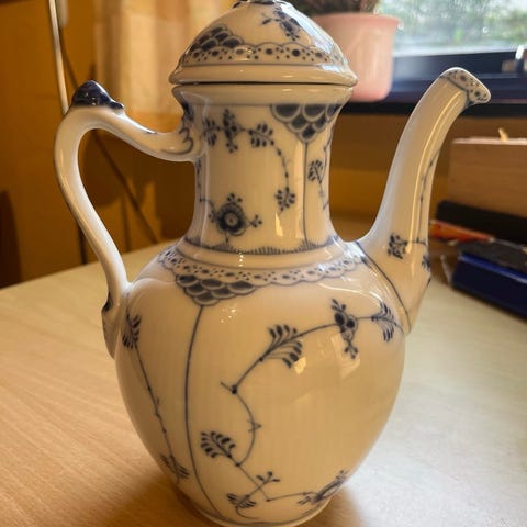 Ældre Royal Copenhagen musselmalet riflet kaffekande, form 48, 1. sortering, ca. 1930–40, uden skår eller revner.”