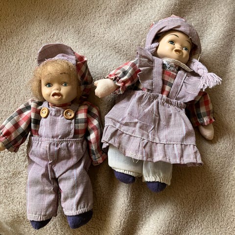 Sjælden vintage 12 inch mattel talking twin doll fra 1970. Iført blomstret tøj med grønne detaljer. Dukken har brunt hår og er klædt i en farverig dragt med blomsterprint. Velegnet som samlerobjekt eller til leg. Der er en snor i ryggen, man kan trække i, og så siger dukken: " Guess how old I am", "Let's take a walk together", I have big blue eyes", eller "would you teach me to dance".