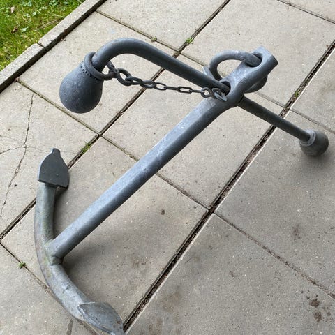 Ældre anker af typen der "slåes" sammen ved at dreje den løse del plan med den faste. Spænder 30 cm. Der medfølger 10 meter ældre blå polyreb. Kun betaling via mobilepay. Fragt på købers ansvar.