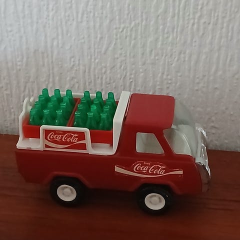Fin gammel retro metal lastbil fra Buddy L (Japan) med sodavandsflasker og sækkevogn i vognen.