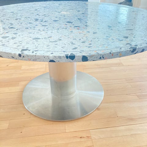 Smukt lyseblåt terrazzo Sofabord fra Normann Copenhagen designet af Simon Legald. Sjælden farvevariant af terrazzo og smukke snoet stål ben. Bordet er meget tungt. Målene er højde 36 cm. bordplade 55x55 cm. Kan afhentes ydre Østerbro