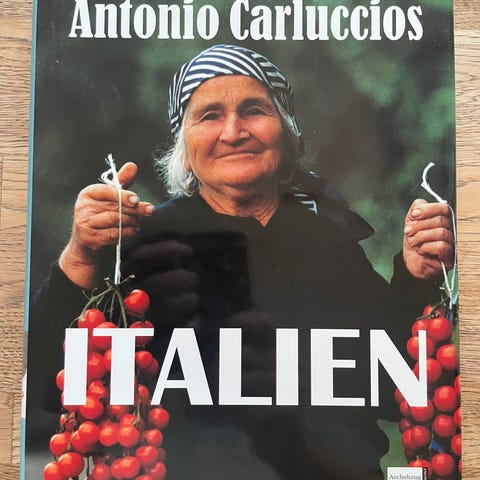 Antonio Carluccio's musik & menuer fra Italien, Antonio Carluccio, emne: mad og vin, Hardback med smudsomslag med brud.