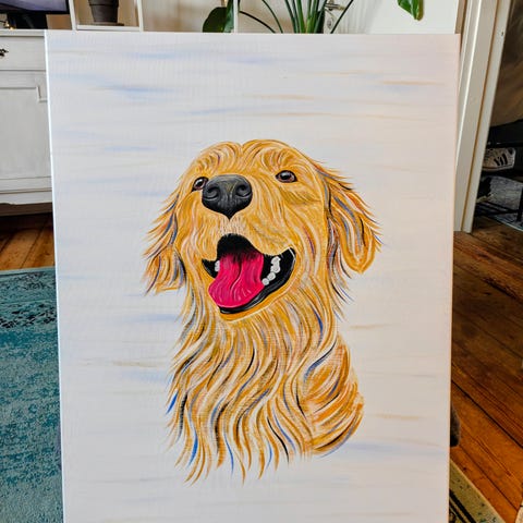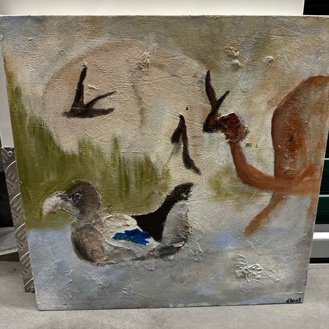 Kunstmaleri med farverigt kvægmotiv på lærred. Maleriet viser to køer og fugle i en abstrakt stil med levende farver. Velegnet til at tilføje et kunstnerisk præg til ethvert rum.. 100 - 100 cm. Skriv ved interesse