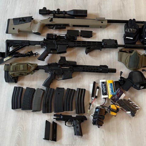 der er nok udstyr til at starte på en en frisk, der er en m4 med 5 midcaps mags