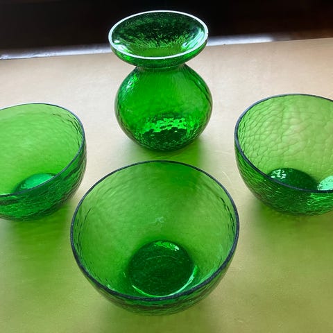 I alt 4 smukke hyacintglas. 2 blå, et søgrønt og et højere i flaskegrønt.