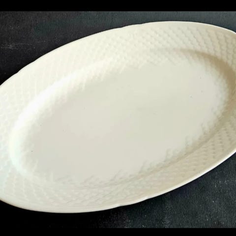 B&G ovalt fad "Æbleblomst" i hvidt glaseret porcelæn med et mønster af skæl og guldkant