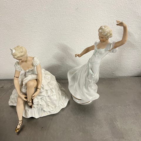 Dresden Porcelæn Ballerina Figurine med detaljeret design. Denne figurine er lavet af porcelæn og har en elegant hvid og blå kjole. Perfekt som dekorativt element i hjemmet.