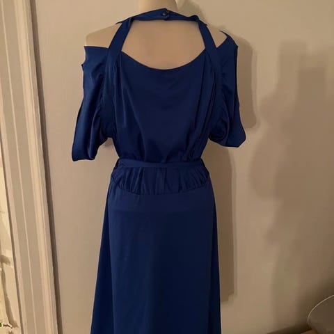 Der står str. 40 i kjolen men jeg vurderer at str. 38-40 er mere korrekt. Længde fra skulder og ned 142 cm, omkreds under arme ca 92 cm, og om baller ca 102 cm:) skal prøves for at få det rigtige indtryk af hvor smuk og elegant den er.
