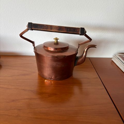 Vintage kobber tekande med håndtag. Fremstillet af kobber med et solidt håndtag, ideel til dekoration eller samling. Kanden har et rustikt udseende, der passer godt ind i traditionelle eller antikke indretningsstile.
