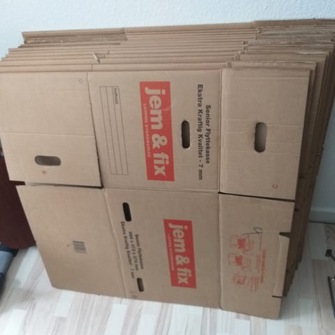 Flyttekasser - brugt en gang. God stand. Flest er jem&fix junior flyttekasser. I alt 30 stk junior og 20 stk. blandet størrelse. Pris er for alle 40 stk,