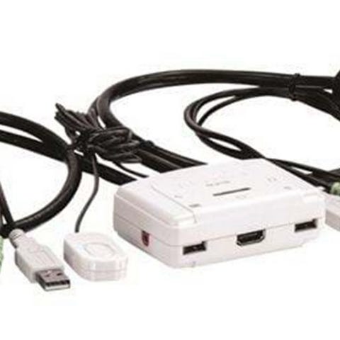 TRENDnet TK-200 KVM Switch i blå. Denne enhed giver mulighed for at styre to computere med et enkelt sæt tastatur, mus og skærm. Den kommer med nødvendige kabler og har PS/2 og VGA tilslutninger. Ideel til dem, der ønsker at optimere plads.