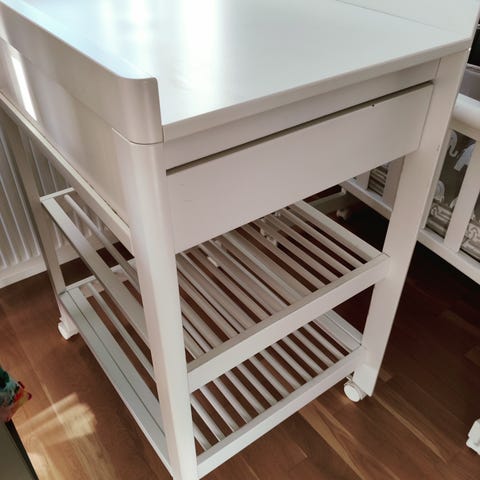 Troll puslebord med 2 hylder, 1 skuffe og 1 udtræks afsat. Vi har været enorm glade for puslebordet. Som ses på billederne er der brugsspor. Men en omgang sort maling, så er den så god som ny igen.