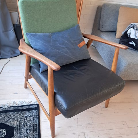 Mørk træ med fjedre. Hynder medfølger ikke men på det sidste billede ses stolen med et par puder, som den har fungeret her. Fjedrene er ikke alle i lige god stand men de fungerer. Med nye hynder vil det være en superflot stol.