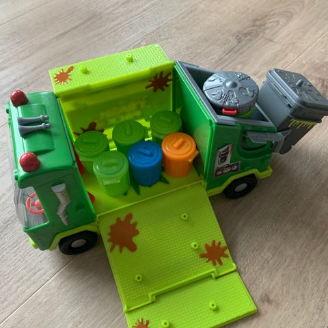 Skraldevogn med udstyr, både affaldscontainer og en masse beholdere.