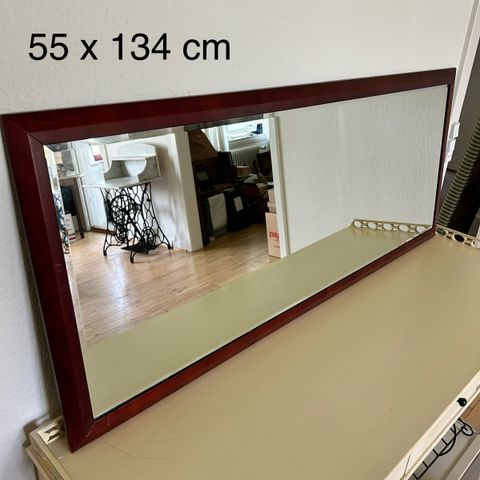 Mål 70x120 cm. Rustik spejl i sort træramme, med nitter. Spejlet har en solid konstruktion og en rå finish, der passer godt til forskellige indretningsstile. En flot patina og slidmærker man må forvente ud fra alderen. Skal afhentes 2 minutter fra Ishøj station