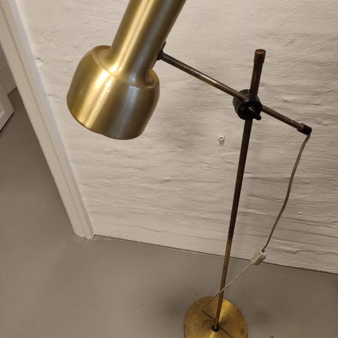Standerlampe i messing den har en enkel metal skærm. Den er funktionel i designet og kan indstilles i højde og lys retning. Den er fra TS belysning ApS. Messingen har aldersrelaterede brugsspor og vil have godt af en gang pudsning. Men en rigtig fin lampe med afbryder på ledningen. Den er 140 cm høj og foden har en dia. på 24 cm. og dia på skærmen er 11 cm. og højden på skærmen 21 cm.