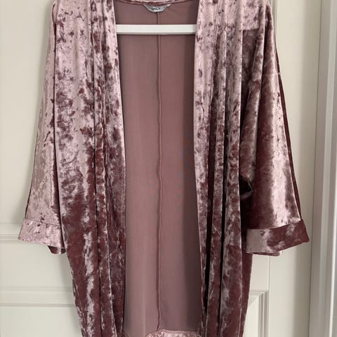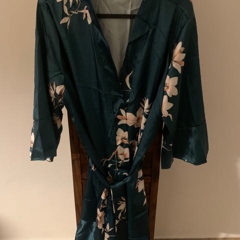 Andet, Vila, str. 40, Grøn med mønster af sort, brun og beige, 100 % Polyester, Næsten som ny, Rigtig fin kimono fra Vila med bindebånd i livet. Bundfarven er grøn med mønster af beige, brun og sort. Jeg har forsøgt at tage et så godt billede som muligt, men lyste driller lidt. Den er brugt en gang og fremstår som ny.