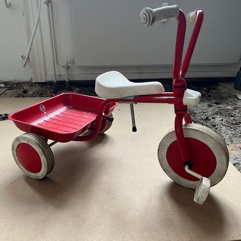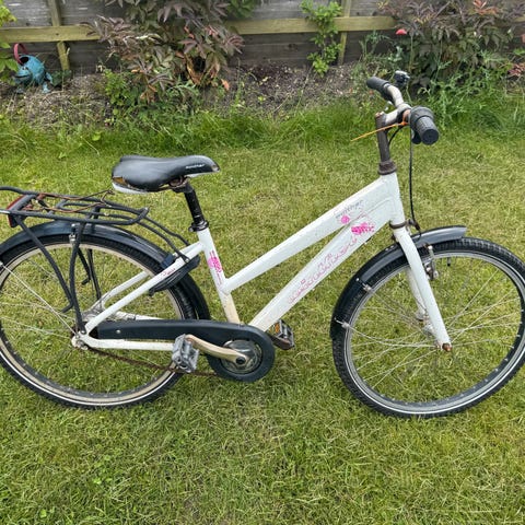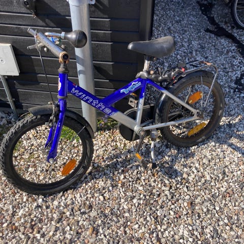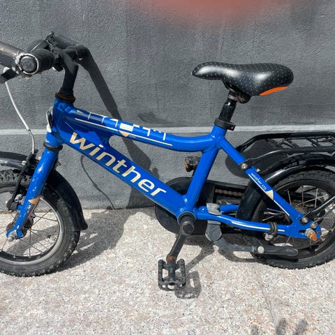 Det er en Winther børnecykel med 5 gear. Den har stået stille i ca. 2 år, så der er ikke luft i dækkene – jeg kan ikke garantere, om de holder tæt. Cyklen har lidt skrammer og brugsspor.