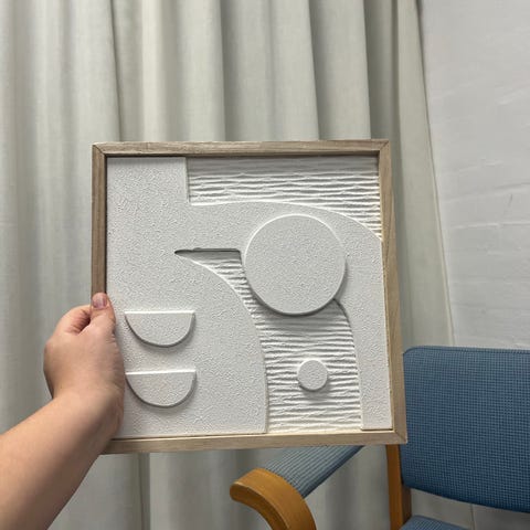 Dekorativt vægrelief med blomstermotiv. Rammen er lavet af træ og har en detaljeret udskæring, der fremhæver det kunstneriske design. Velegnet til indendørs udsmykning og kan tilføje et klassisk præg til ethvert rum.