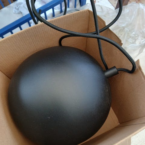 Skærm og tallerken i kobber. Sort stofledning. Stor fatning, 220 V. Velegnet til LED