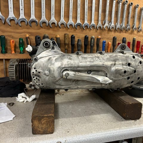 OBS: Motorblokken er overordnet set i god stand, med få bemærkning motor.nr. er slid af, 1 gevind til gearing er løst herfor skal man sætte en møtrik på modsatte side, lidt af gevindet på bagsiden til den ene udstødning gevind knækket af disse er i øvrigt M10, nogle gevind til kickstarten er lidt slidt herfor skal man bruge bolte der lange og evt. sættes en møtrik på modsat side hvilket der er plads til, og man kan ikke montere centerstøttefod på denne motor. Alt sammen mere eller mindre uden betydning ved at følge disse anvisninger.