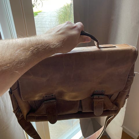 Aunts & uncles skuldertaske i læder. Tasken er brun og har en justerbar skulderrem. Den er udstyret med flere lommer til praktisk opbevaring. Indvendigt er der et mønstret for, der tilføjer et stilfuldt touch. Velegnet til daglig brug. Købt i Louisianas museumsbutik.