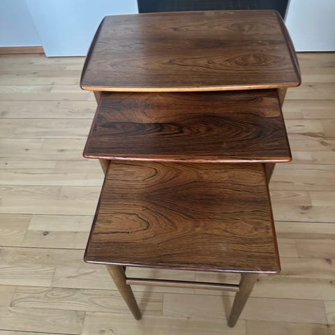 2 stk palisander indskudsborde højde 46/41 brede 47/38 dybde 31/26 de er i pæn stand sælges samlet . Designer Severin Hansen for Haslev møbelfabrik 1960’erne .