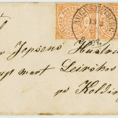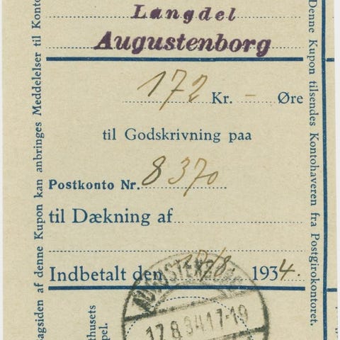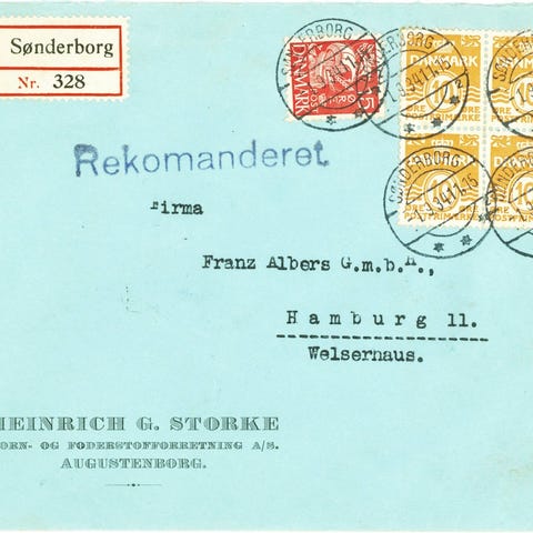 5 øre bølgelinie og 2 x 40 øre Chr. X på værdibrev med indlagt 133 kr. fra Augustenborg, stemplet 5.10.1925. Sendt til Kiel, Tyskland. Bagpå ankomststempel 6.10.1925 samt to laksegl.