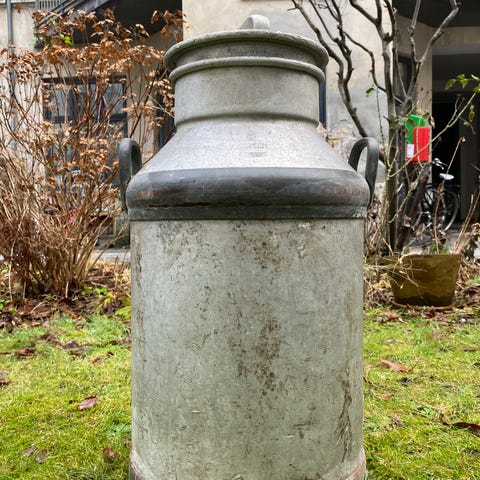Gammel mælkespand fremstillet i metal med låg og to håndtag. Spanden har en cylindrisk form og er velegnet til opbevaring eller dekoration. Overfladen viser tegn på patina og brug, hvilket indikerer alder og tidligere anvendelse.