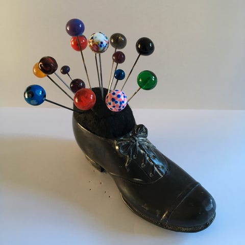 Gammel nålepude sko, med gamle nipsenåle, måler 12 cm i længden