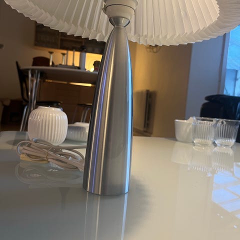 Bordlampe LK 375 i messing designet af Philip Bro Ludvigsen i 1999. Lampen har lidt ridser på bagsiden, men ses kun tæt på (se foto 4). Lampen sælges med pæreklemme skærm. Lampe højde inkl skærm er 31 cm. Lampen kan godt sendes, men skærmen er svært at pakke forsvarligt. Der kan tilkøbes original Le Klint stativ for 150 kr se foto nr 9. Lampen sælges uden el pære.