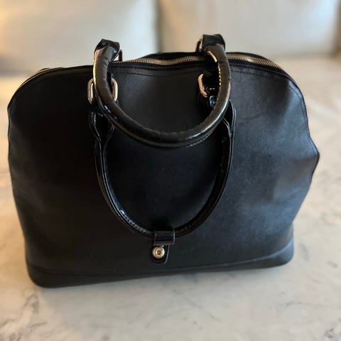 Stilfuld sort taske med en justerbar skulderrem og en dekorativ sølvkæde. Tasken har en lynlåslukning og et lille trekantet mærke på forsiden. Perfekt til at bære dine vigtigste ejendele med stil.