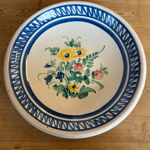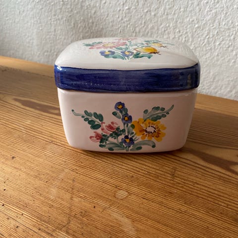 Der er et lille afslag på kant ved fod, samt glasurslid på kant foroven.