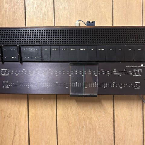 Bang & Olufsen Beomaster 1100 Radio med træfinish. En vintage radioenhed med manuel tuning og knapper til frekvensvalg. Strømforsyning: 110-240V, 50Hz, 20-170W. Fremstillet i Danmark. Passer til brugere, der ønsker en klassisk radiooplevelse med analog betjening.