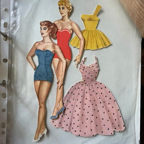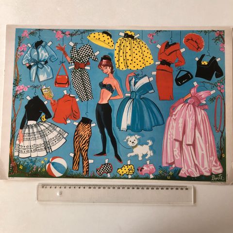 Fin påklædningsdukke, der kan sættes på magnettavle og iklædes forskelligt tøj.